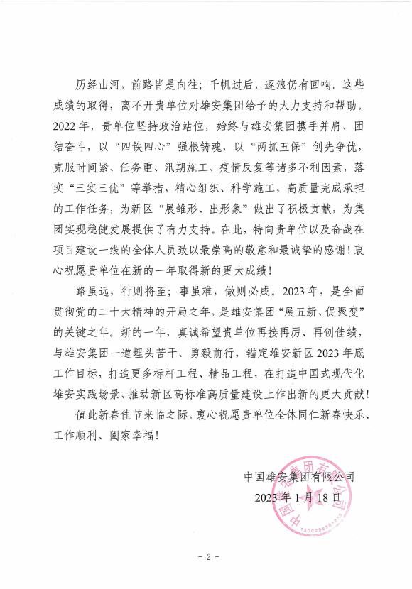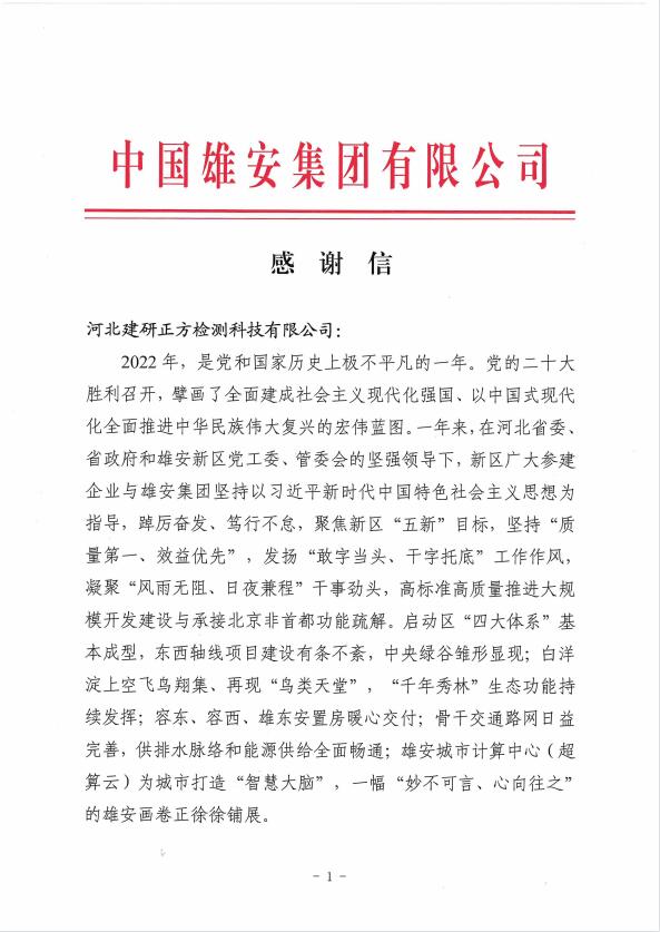 近日,建研正方公司收到雄安集團(tuán)發(fā)來(lái)的感謝信,對(duì)建研正方公司2022年為雄安新區(qū)發(fā)展建設(shè)所做出貢獻(xiàn)表示感謝。
