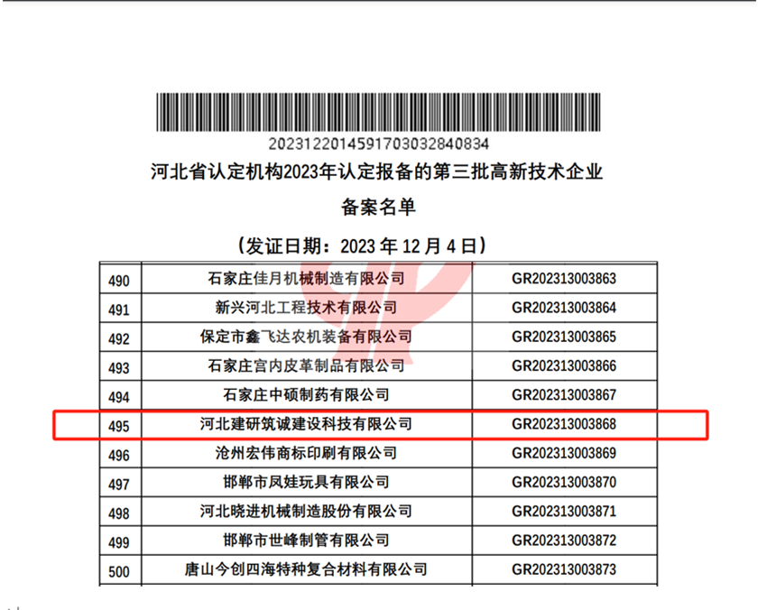 2023年12月20日,全國高新技術(shù)企業(yè)認(rèn)定管理工作領(lǐng)導(dǎo)小組辦公室公示了河北省認(rèn)定機(jī)構(gòu)2023年認(rèn)定報(bào)備的第三批高新技術(shù)企業(yè)備案名單,河北建研筑誠建設(shè)科技有限公司順利通過了國家高新技術(shù)企業(yè)認(rèn)定(證書編號GR202313003868),標(biāo)志著公司在科技創(chuàng)新的道路上又邁出了堅(jiān)實(shí)的一步。